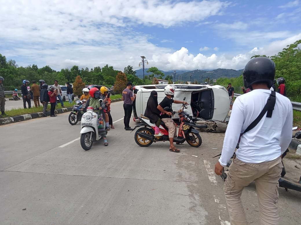 Mobil tersebut menabrak pembatas jalan, hingga melompat dan terguling beberapa kali hingga menimpa pengendara sepeda motor.