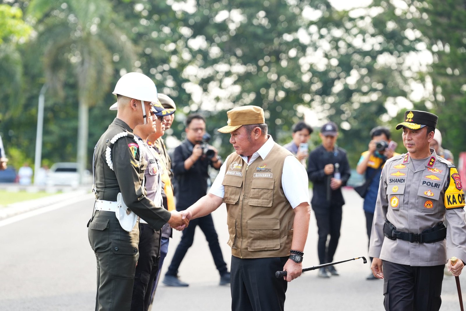Usai memimpin apel, Gubernur Herman Deru bersama Kapolda Sumsel melakukan pemeriksaan pasukan dan penyematan pita Operasi Ketupat 2026 sebagai tanda dimulainya operasi pengamanan Lebaran tersebut.