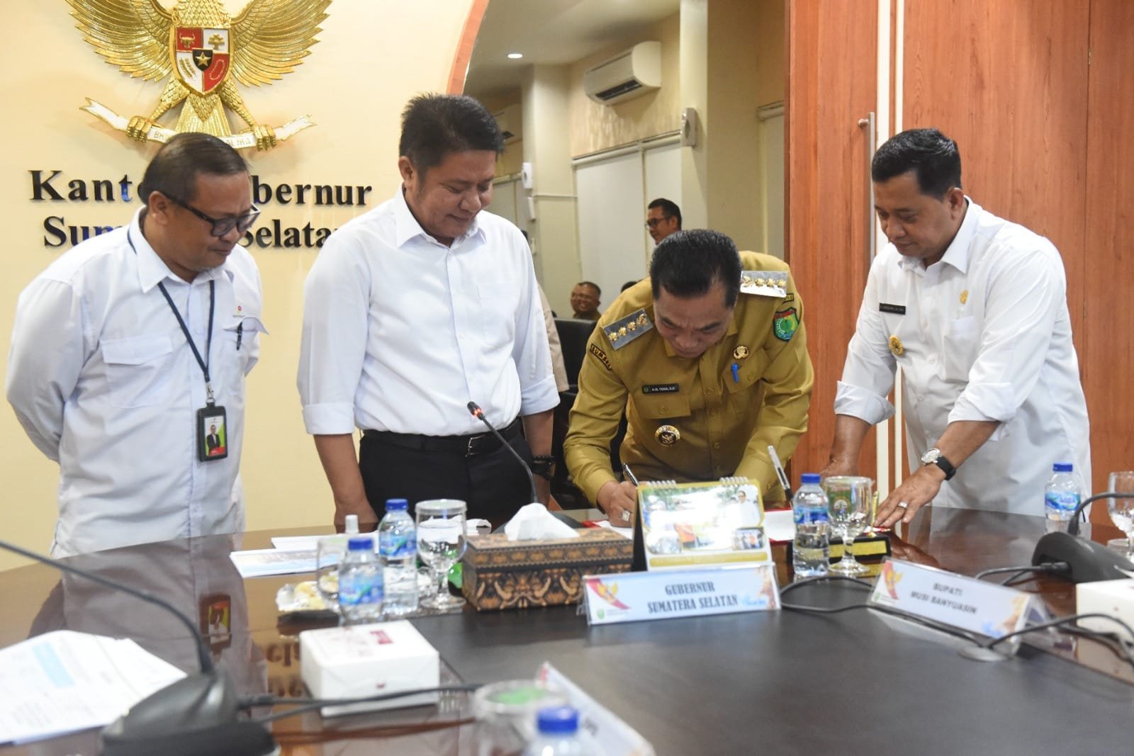 SUMSELDAILY.CO.ID, PALEMBANG – Gubernur Sumatera Selatan (Sumsel) H Herman Deru bersama Bupati Kabupaten Musi Banyuasin H. M. Toha dan Bupati Banyuasin H. Askolani menandatangani berita acara kesepakatan bersama terkait persentase pembagian porsi saham participating interest 10 persen pengelolaan minyak dan gas bumi Wilayah Kerja Rimau, bertempat di ruang tamu Gubernur Sumsel, Senin (5/5/2025).