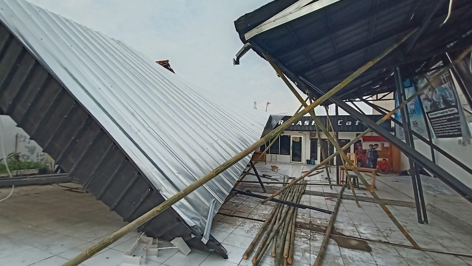 SUMSELDAILY.CO.ID, KARAWANG – Atap bangunan tempat steam pencucian kendaraan yang bernama SAN’S CAR WASH & CAFE yang berlokasi di Kp.Krajan Rt 01, Rw 08, Kelurahan Palumbonsari, Kecamatan Karawang Timur, Kabupaten Karawang, roboh saat hujan deras, Rabu (6/7/2022).
