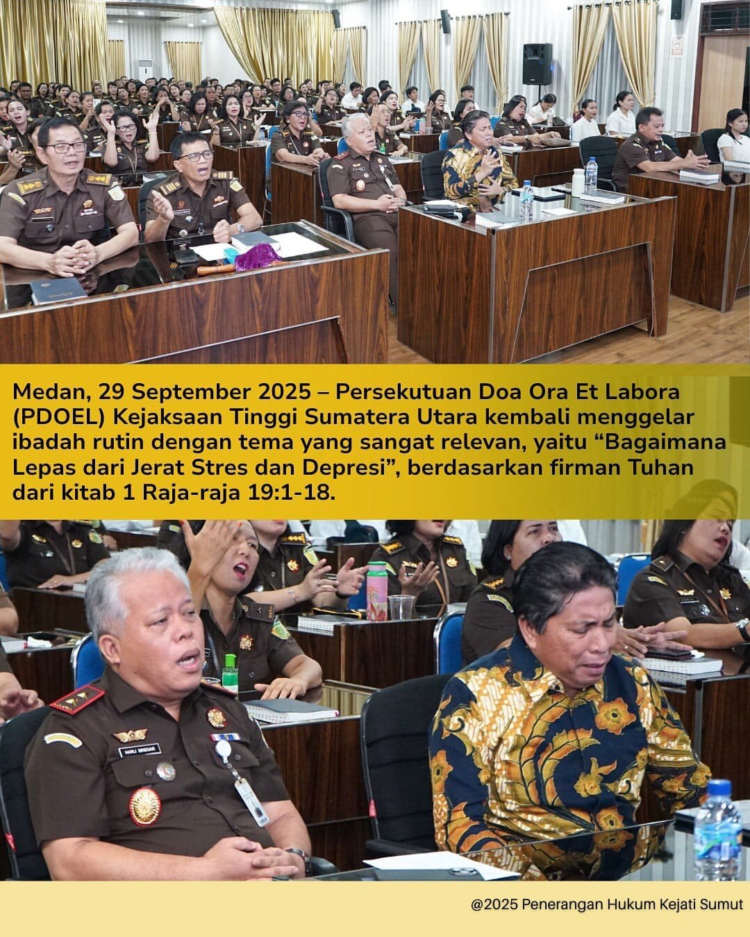 Tekanan kerja yang tinggi, beban tanggung jawab, serta sorotan publik kerap menjadi bayang-bayang yang tak terpisahkan dari profesi aparat penegak hukum. Realitas ini diakui Kejaksaan Tinggi Sumatera Utara yang melalui Persekutuan Doa Ora Et Labora (PDOEL) menggelar ibadah dengan tema “Bagaimana Lepas dari Jerat Stres dan Depresi”, Senin (29/9/2025).