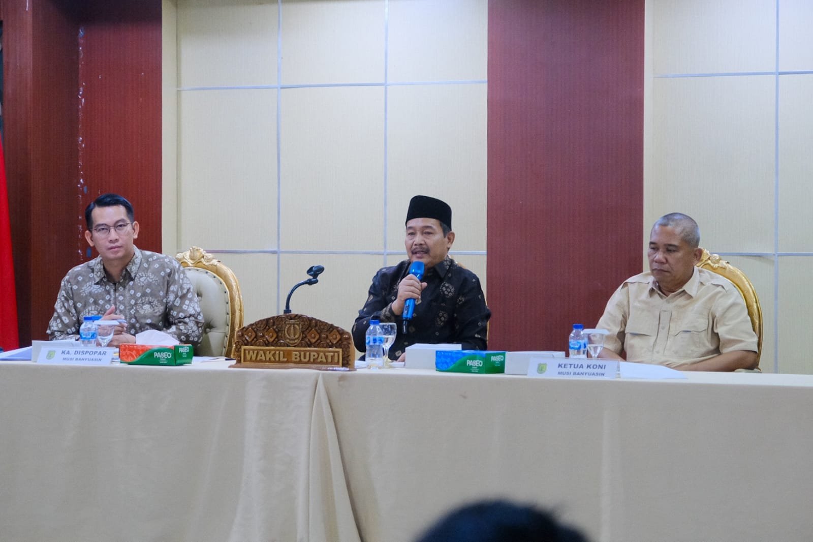 Rapat yang dipimpin langsung oleh Wakil Bupati Muba, Rohman mewakili Bupati H M Toha digelar di Auditorium Pemkab Muba, Jumat (9/5/2025) pagi, berlangsung dinamis dan penuh semangat kolaboratif. Hadir Kepala Dispopar Muba M. Fariz, Ketua KONI Muba Marjoni, jajaran OPD, Forkopimda, dan pemangku kepentingan terkait lainnya.