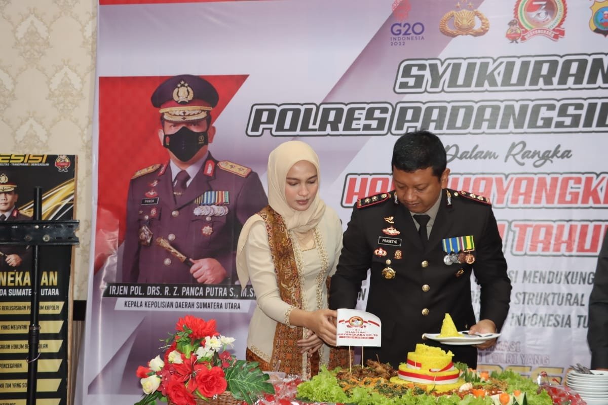 SUMSELDAILY.CO.ID, PADANGSIDIMPUAN – Suasana syukuran HUT Bhayangkara ke-76 di Polres Padangsidimpuan meski berlangsung dengan meriah, namun tetap khidmat, Selasa (5/7/2022) pagi. Acara syukuran ditandai dengan pemotongan nasi tumpeng oleh Kapolres Padangsidimpuan, AKBP Dwi Prasetyo Wibowo, SIK.