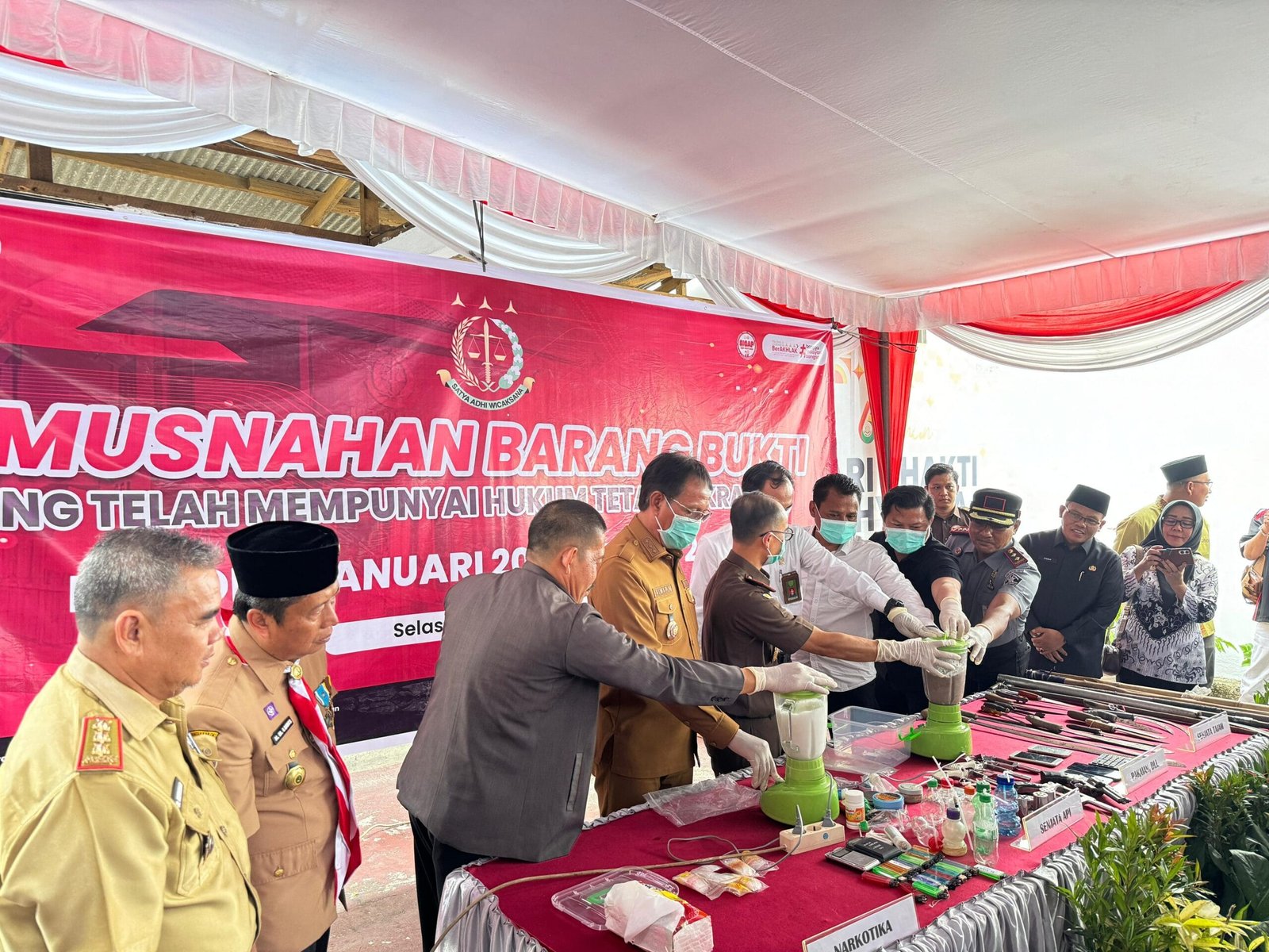 Pemusnahan dilakukan dengan berbagai cara sesuai jenis barang bukti. Narkotika diblender dan dibuang, senjata api dan senjata tajam dipotong dengan mesin gerinda, sedangkan pakaian dan barang bukti lainnya dibakar. Proses ini dilakukan secara menyeluruh dan aman untuk memastikan barang bukti tidak dapat disalahgunakan lagi.