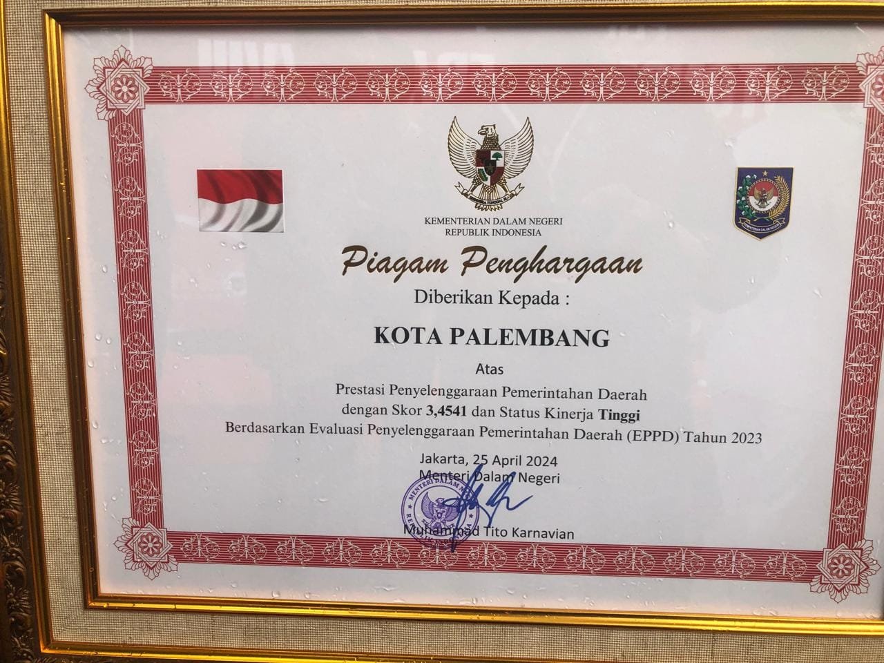 Pj Wali Kota Ratu Dewa mengungkapkan bahwa penghargaan itu diberikan hanya kepada 5 provinsi, 10 kota dan 14 kabupaten se-Indonesia yang memiliki kinerja terbaik.