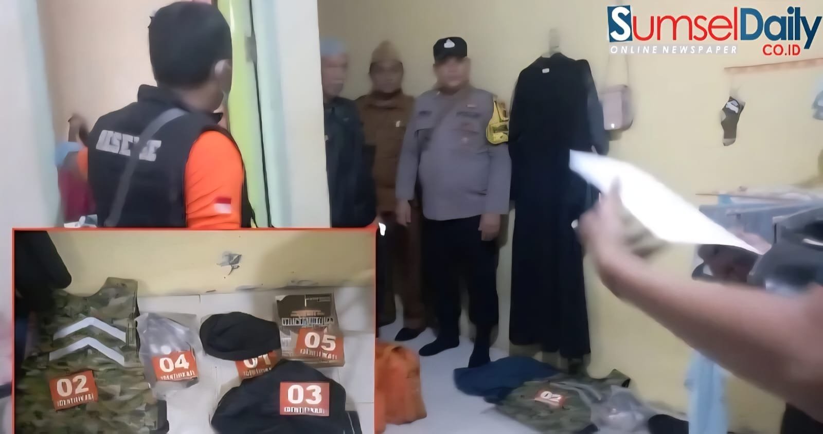 Dalam penggeledahan tersebut, petugas menemukan sejumlah barang bukti, antara lain jubah, buku bertema khilafah islamiyah, rompi loreng, topi dan stiker berlogo tertentu.