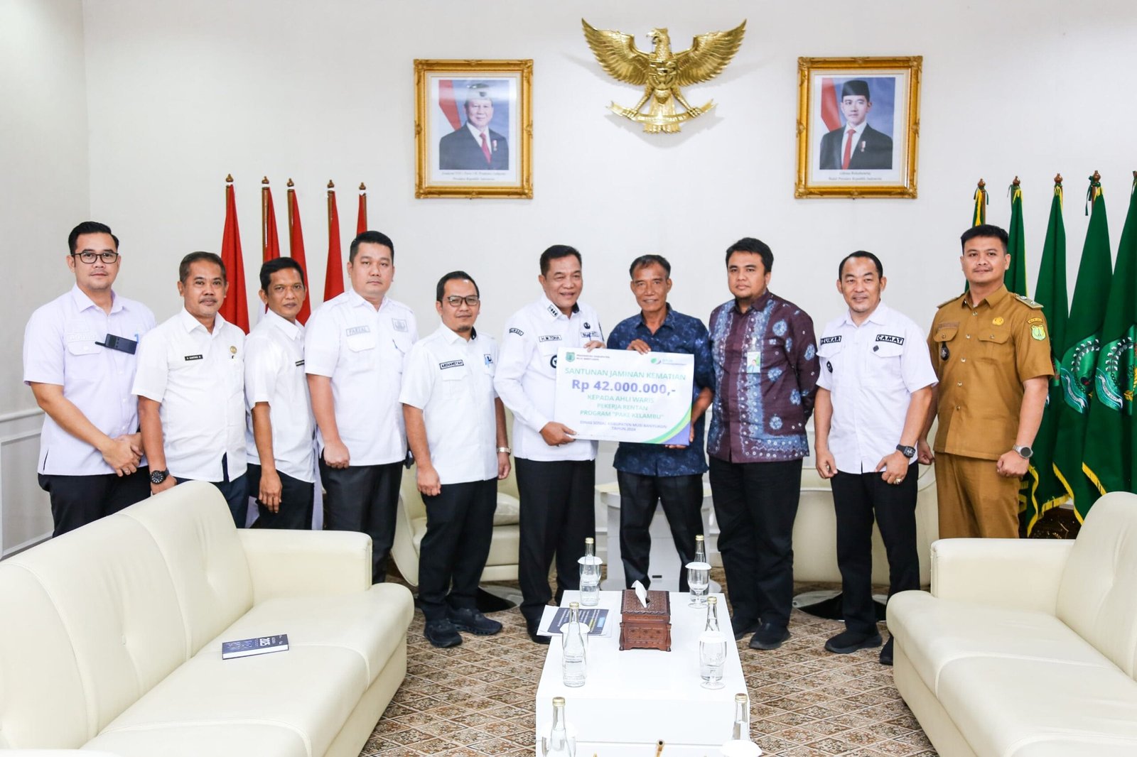 SUMSELDAILY.CO.ID, MUBA – Bupati Kabupaten Musi Banyuasin H M Toha bersama BPJS Ketenagakerjaan Muba serahkan santunan jaminan kematian kepada ahli waris pekerja rentan program pake kelambu. Santunan kematian yang diberikan ini sebesar Rp 42 juta kepada ahli waris Almarhumah Nurhasana, Rabu (28/5/2025) bertempat di Kantor Bupati.