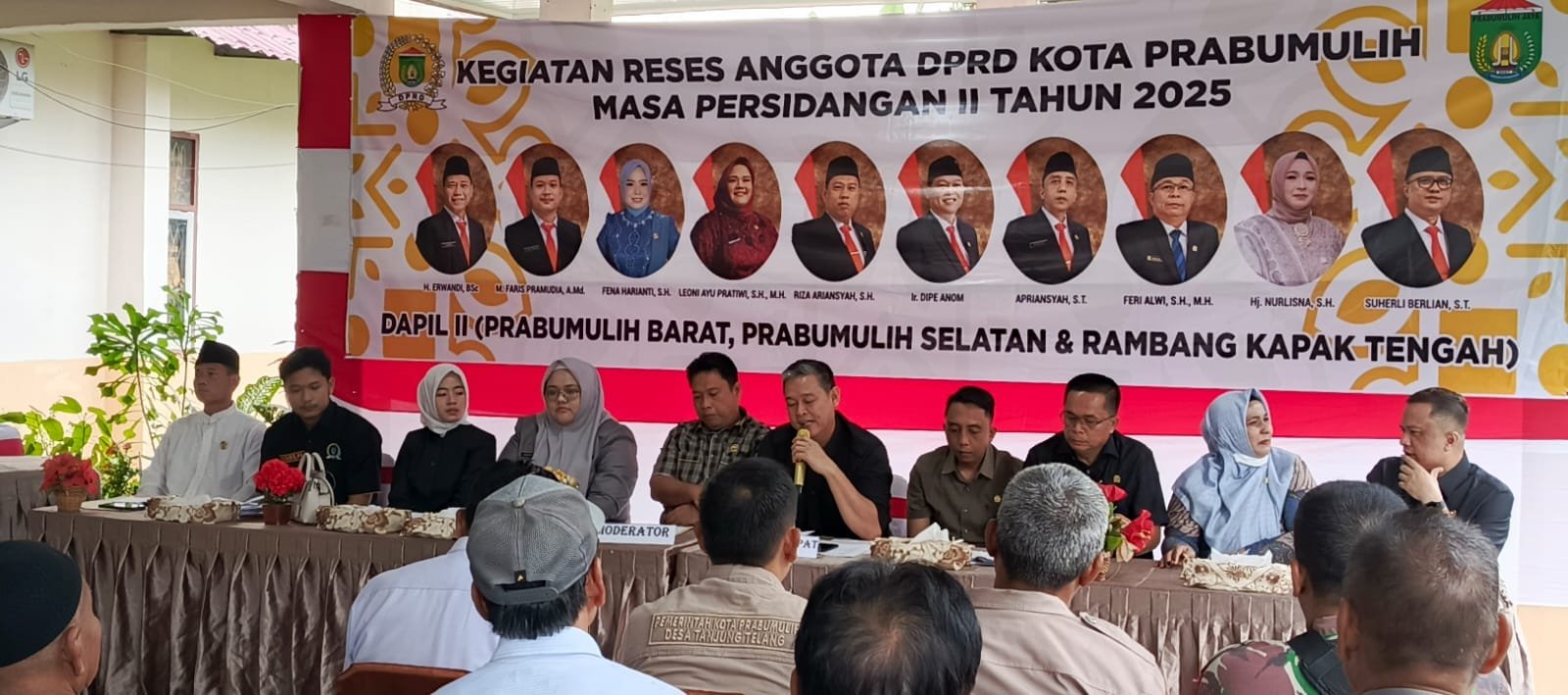 Reses di awal 2025 in diketuai Ir Dipe Anom merupakan Wakil Ketua II DPRD Prabumulih, disampaikan Anggota DPRD, antara lain; H Erwadi BSc, M Faris Pramudia AMd, Leoni AP SH MH, Riza Ariansyah SH, Apriansyah ST, Feri Alwi SH MH, Hj Nurlisna SH, dan Suherli Berlian ST.